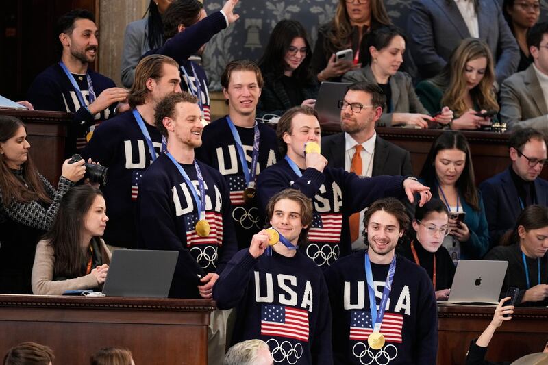 The hockey players, wearing their medals and “USA” sweaters, drew a bipartisan standing ovation. Trump pointed to the Democratic side of the chamber and quipped, “That’s the first time I ever I’ve ever seen them get up.”