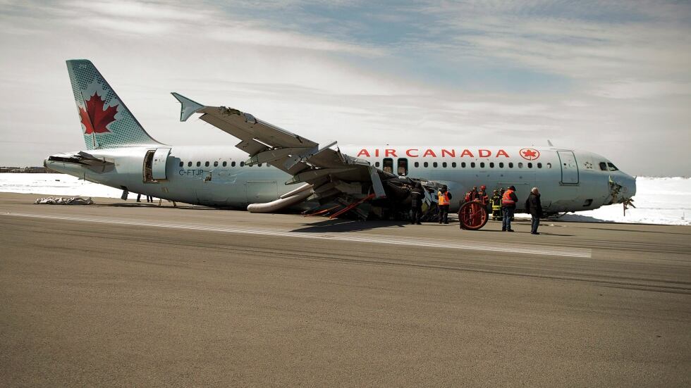 The Air Canada jet crash-landed on March 29, 2015, after it struck a power line and an antenna array and cut power to the airport.