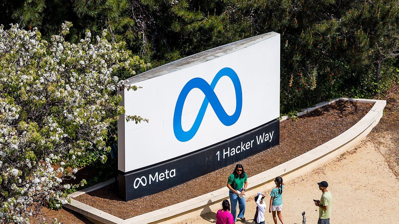 Visitors gather at a sign outside Meta headquarters on Thursday, March 26, 2026, in Menlo Park, Calif. (AP Photo/Noah Berger)