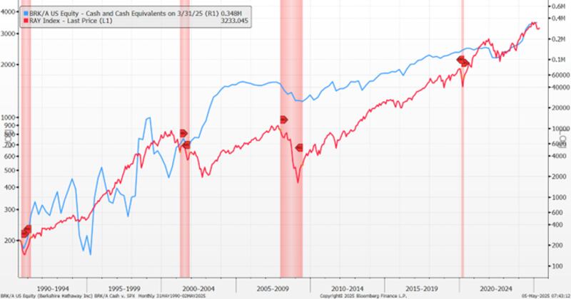 It’s not market timing! The blue line is the amount of cash and equivalents at Berkshire Hathaway. He tends to boost cash when there is less opportunity in equity markets and tends to use cash when markets (or parts of it) offer better value than cash.